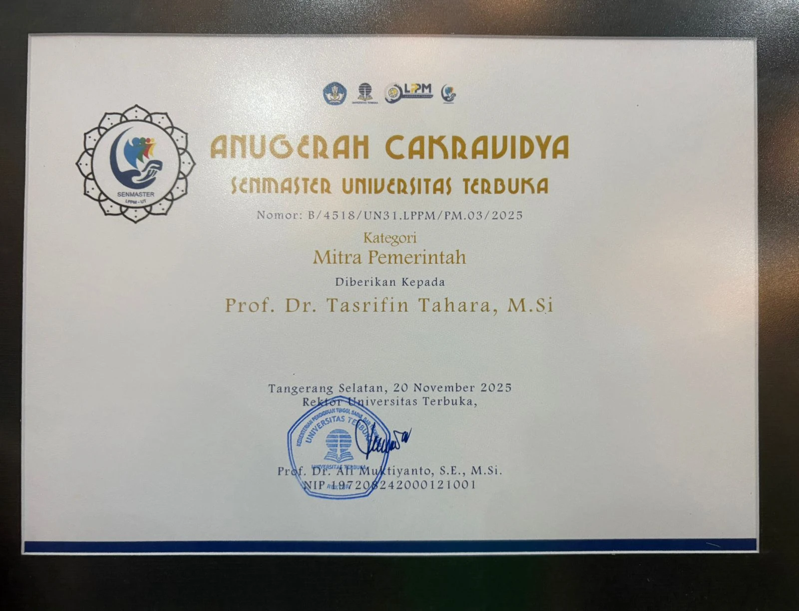 Penghargaan tersebut diserahkan langsung oleh Rektor Universitas Terbuka, Prof. Dr. Ali Muktiyanto, S.E., M.Si., yang menilai Prof. Tasrifin memiliki kontribusi besar sebagai mitra strategis UT dalam pelaksanaan program Pengabdian kepada Masyarakat internasional di berbagai negara.