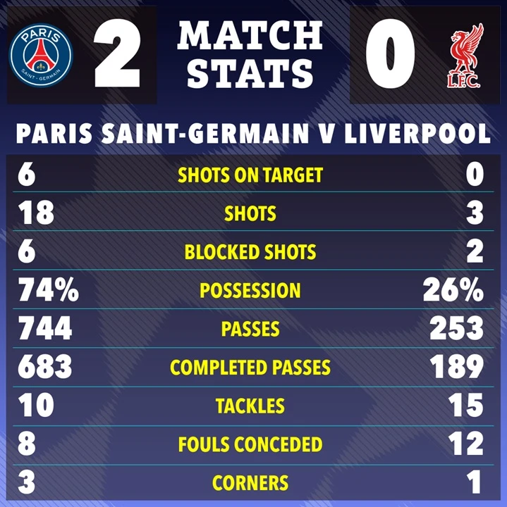 Statistik Pertandingan PSG vs Liverpool. (The Sun)