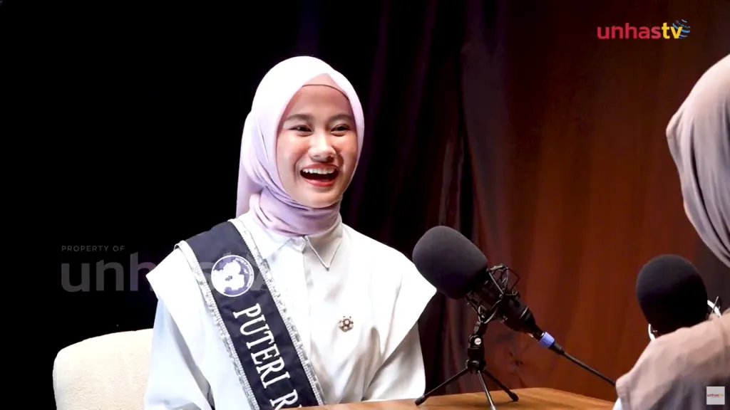 Kehadirannya di Studio Unhas TV untuk program siniar Unhas Story, tampak sederhana, tanpa hiruk-pikuk selebritas. Namun, selempang bertuliskan “Putri Remaja” yang kini disandangnya bukan sekadar aksesoris.