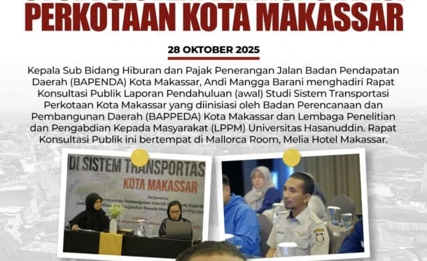 MAKASSAR, UNHAS.TV - Kepala Sub Bidang Hiburan dan Pajak Penerangan Jalan Badan Pendapatan Daerah (Bapenda) Kota Makassar, Andi Mangga Barani, menghadiri Rapat Konsultasi Publik Laporan Pendahuluan (awal) Studi Sistem Transportasi Perkotaan Kota Makassar, Selasa (28/10/2025).