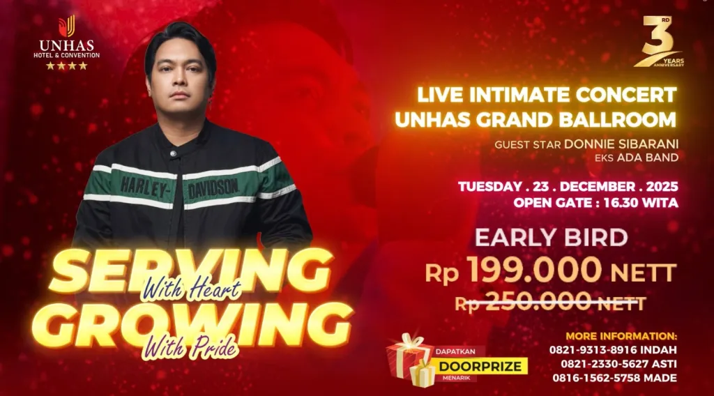 MAKASSAR, UNHAS.TV - Menandai perjalanan tiga tahun kiprahnya di industri perhotelan, Hotel Unhas & Convention akan menghadirkan konser spesial bertajuk “Serving with Heart, Growing with Pride” pada Selasa, 23 Desember 2025 mendatang.