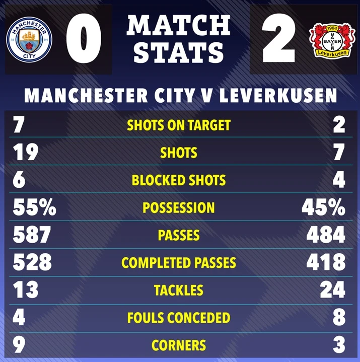 Statistik pertandingan Manchester City saat kalah 0-2 dari Bayer Leverkusen. (screenshot the sun)