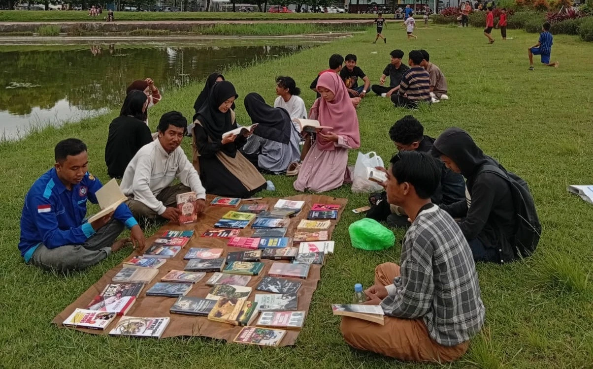 Tampak sejumlah warga dan mahasiswa menggelar Lapak Literasi di RTH Syekh Yusuf Sungguminasa, Sabtu (4/4/2026). (Dok Jariah Publishing)