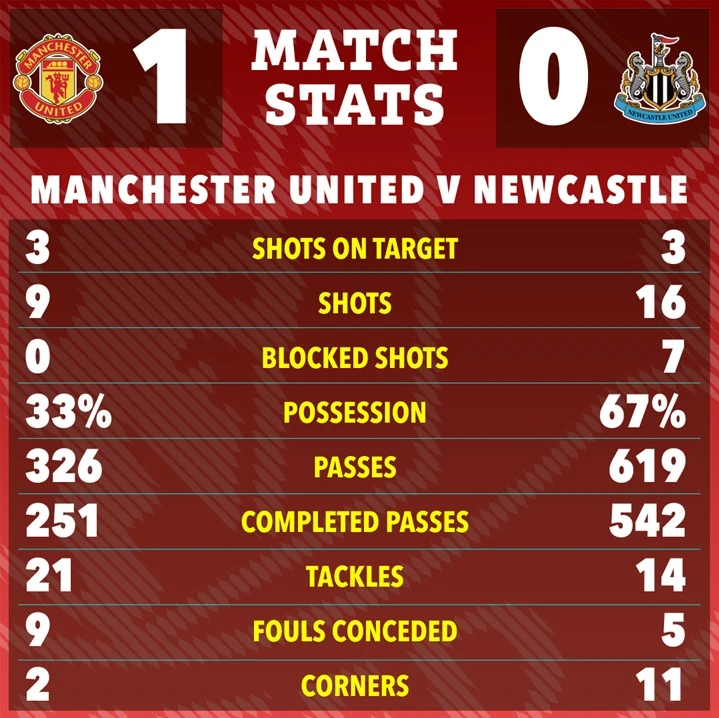 Statistik Manchester United 1 vs 0 Newcastle United. (the sun)
