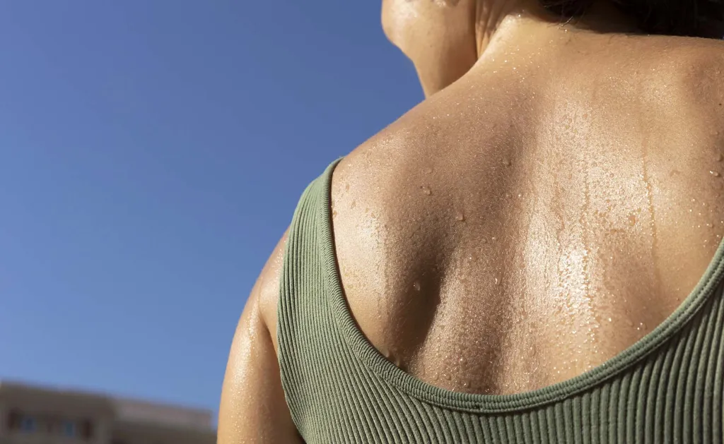 HIPERHIDROSIS. Ilustrasi seorang wanita tengah berkeringat secara berlebihan mengalami hiperhidrosis. (dok freepick)