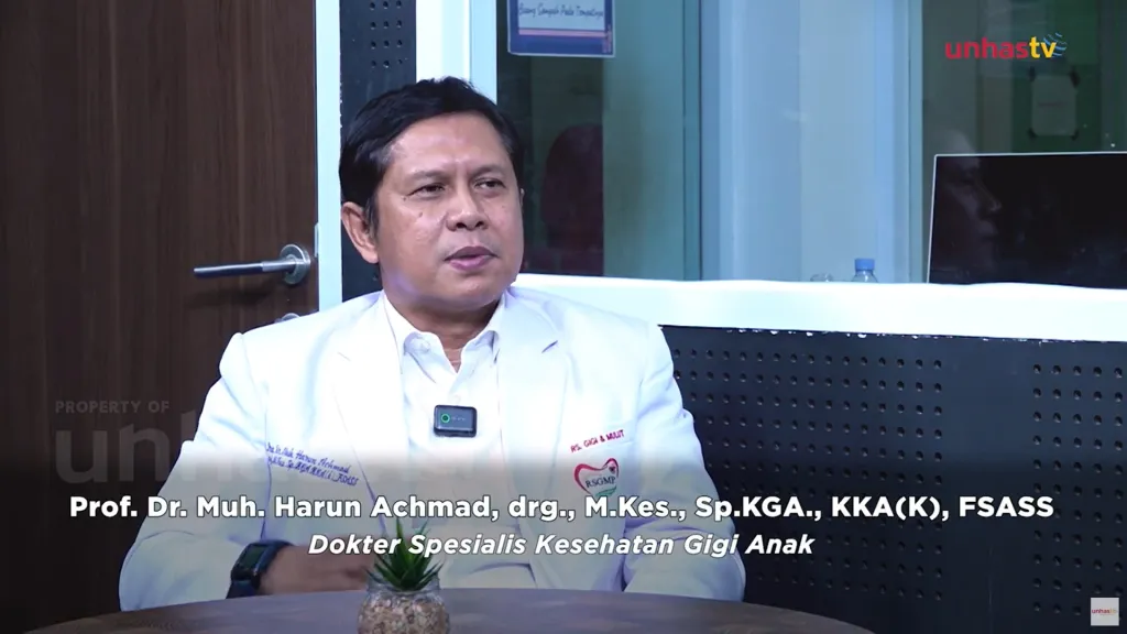 Di studio Unhas.TV siang itu, hadir seorang narasumber yang sudah malang-melintang dalam dunia kedokteran gigi anak, Prof. Dr. drg. Muhammad Harun Achmad, M.Kes., Sp.KGA(K).