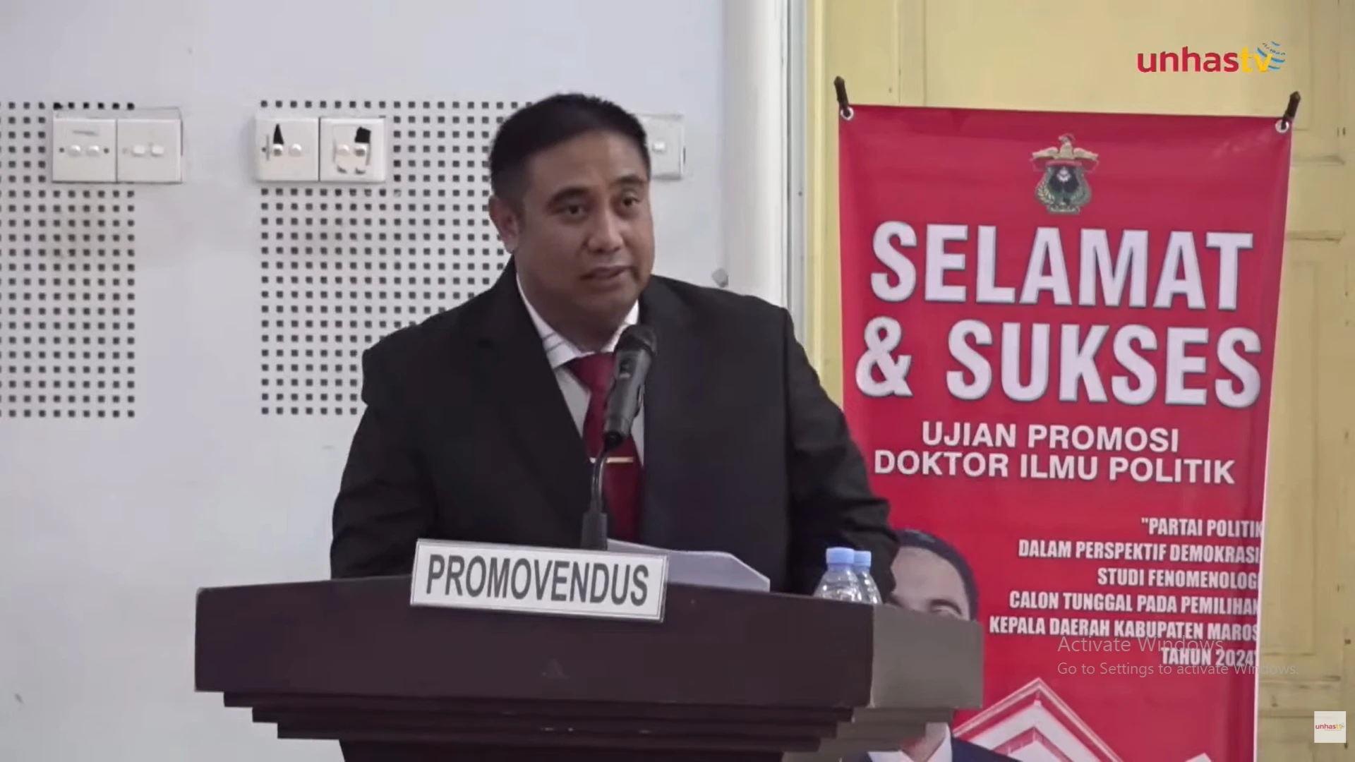 PROMOSI DOKTOR. Bupati Maros HAS Chaidir Syam berhasil mempertahankan disertasi dalam promosi doktor ilmu politik di Aula Prof A Amiruddin, FK Unhas, Rabu (11/2/2026). Chaidir mengangkat topik pemilihan calon bupati tunggal di Kabupaten Maros. (dok unhas tv)