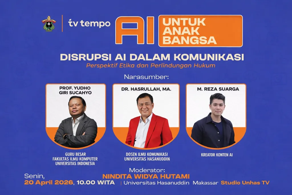 MAKASSAR, UNHAS.TV – Perkembangan kecerdasan buatan atau Artificial Intelligence (AI) yang kian pesat mendorong kolaborasi antara TV Tempo dan Unhas TV untuk menghadirkan diskusi publik bertema “Disrupsi AI dalam Komunikasi: Perspektif Etika dan Perlindungan Hukum”.