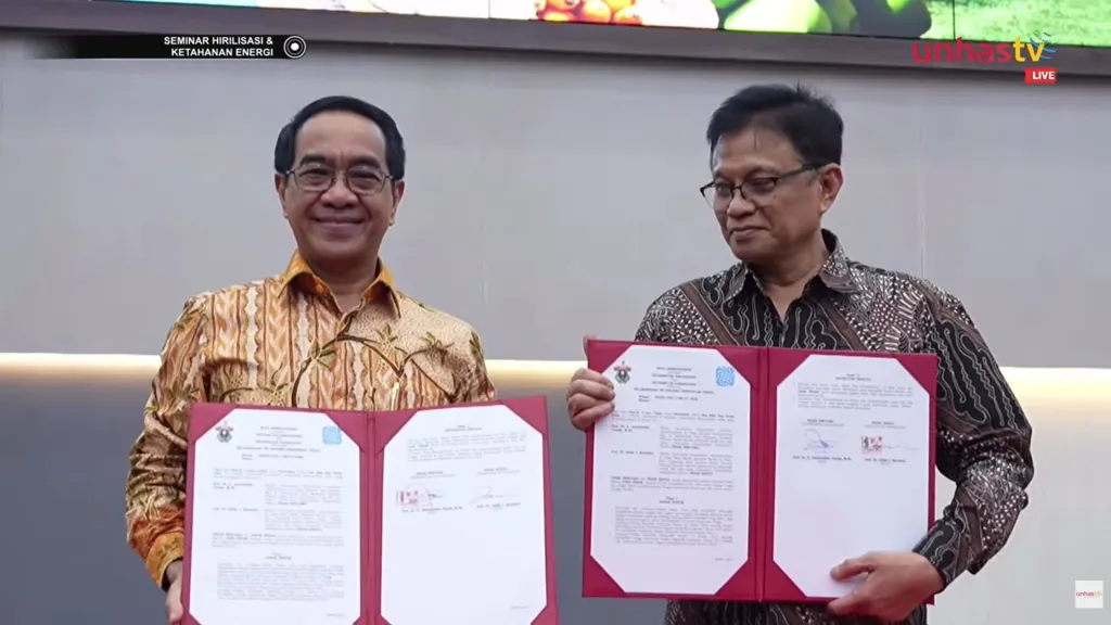 Penandatanganan MoU dilaksanakan di atas panggung setelah acara pembukaan. Selain kedua rektor, turut hadir Wakil Rektor Bidang Kemitraan, Inovasi, Kewirausahaan, dan Bisnis Unhas Prof Dr Eng Adi Maulana ST MPhil serta Sekretaris Sekretariat Satgas Percepatan Hilirisasi dan Ketahanan Energi Nasional (PHKEN), Dani Setiawan.