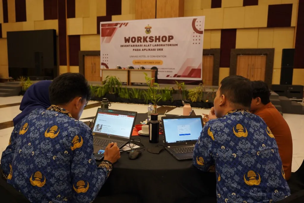 APLIKASI UKK. Workshop inventarisasi peralatan laboratorium berbasis aplikasi UKK di Unhas Hotel and Convention, Rabu (1/10/2025). (dok unhas.tv)