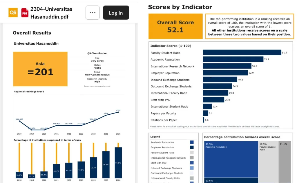 Dalam laporan resmi QS, Unhas meraih skor keseluruhan 52,1. Indikator dengan nilai tertinggi datang dari rasio dosen dan mahasiswa sebesar 91,9, reputasi akademik 71,1, serta jejaring riset internasional 56,9.